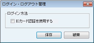 [ログイン・ログアウト管理] 画面が表示される。[ログイン方法] 欄の [ICカード認証を使用する] にチェックを付けることで、アカウントへのICカード登録、ICカードによるログインができるようになる。