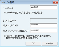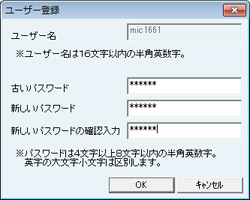 [ユーザー名]を半角英数字で16文字以内、[新しいパスワード][新しいパスワードの確認入力]を半角英数字4~8文字以内で入力します。入力が完了したら[OK]ボタンをクリックします。