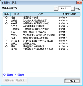[各種届出の設定]画面が表示される。設定を行う届出の項目を選択し、[施設基準の届出設定]ボタンをクリックする。選択した届出名称の画面が表示される。[届出][取り下げ]ボタンをクリックし、期間を入力したら[OK(F12)]ボタンをクリックして届出履歴を登録する。登録が終了したら[保存]ボタンをクリックし、[各種届出の設定]画面で[閉じる]ボタンをクリックして終了する。