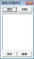 [医院の年間休日]画面が表示され、登録した月日が確認できる。[追加]ボタンをクリックして月日を入力し、[OK]ボタンをクリックする。これを繰り返して年間休日を登録する。