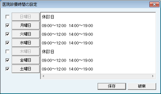 [医院診療時間の設定]画面が表示される。診療曜日のチェックボックスにクリックでチェックを付ける。各曜日のボタンをクリックすると[曜日診療時間の編集]画面が表示される。[追加]ボタンをクリックして時間を入力する。午前・午後それぞれ診療時間を追加する。[OK]ボタンをクリックで登録。各診療日を登録する。