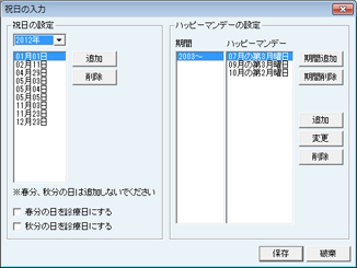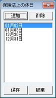 [保険法上の休日]画面が表示される。年末年始等の休日を登録する。[追加]ボタンをクリックし[日付の入力]画面が表示されるので、日付を入力し[OK]ボタンをクリックして登録する。登録した日付を削除する場合は、削除する日付をクリックで選択し、[削除]ボタンをクリックする。