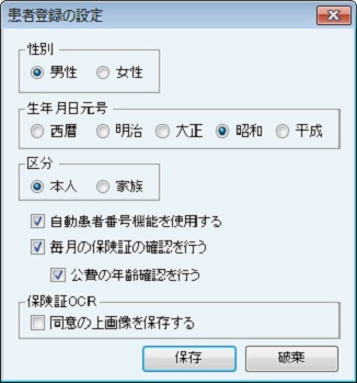 [患者登録の設定]画面が表示される。新患登録時に表示される[性別・生年月日元号・区分]の初期値を設定する。各項目の初期値をクリックで選択する。[自動患者番号機能]・[毎月の保険証の確認]・[公費の年齢確認を行う]・[保険証OCR]を使用する場合は、各チェックボックスにチェックを付ける。