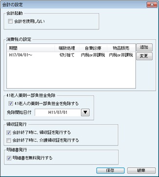 [会計の設定]画面が表示される。任意登録モード使用時など会計機能を使用しない場合、[会計を使用しない]のチェックボックスにクリックでチェックを付ける。[消費税額の端数処理]など消費税の設定の追加・変更をおこなえる。