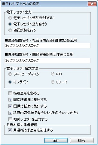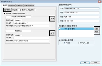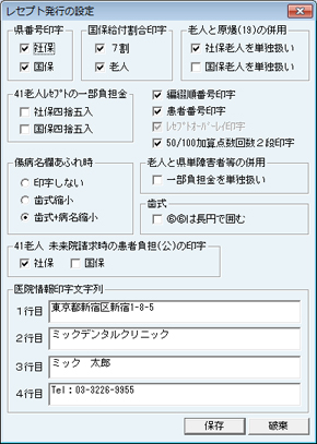 [レセプト発行の設定]画面が表示される。レセプト印字に関する詳細をここで設定する。[医院情報印字文字列]には医院の情報を正確に入力する。