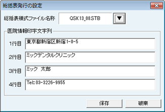 [総括表発行の設定]画面が表示される。[総括表様式ファイル名称]で自県の様式ファイルをプルダウンボタンをクリックして選択する。[医院情報印字文字列]には医院情報の設定で入力したものが反映されている。変更する場合は、各行に直接入力する。