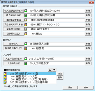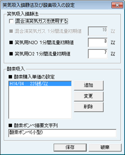 [笑気吸入鎮静法及び酸素吸入の設定]画面が表示される。使用している笑気用ガス・酸素に合わせて1分間流量初期値や購入単価の設定をおこなう。