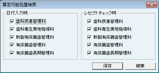 算定可能処置検索をおこなう処置のチェックボックスをクリックしてチェックを付ける。チェックを付けた項目が算定可能な場合、診療日の入力時・レセプトチェック時に、算定可能である旨のメッセージが表示され、入力漏れを防ぐことができる。