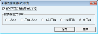 [新製義歯調整料の設定]画面が表示される。[ダイアログ自動呼出しする]にチェックを付けると、月をまたがって[新製義歯調整]の入力をする際などに、義歯を新製した日付を問い合わせるメッセージが表示される。また[摘要欄歯式印字]では、レセプトに印字する歯式を選択する。