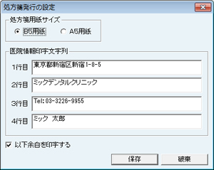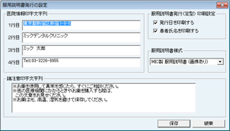 [服用説明書発行の設定]画面が表示される。[医院情報印字文字列]には医院情報の設定で入力したものが反映されている。変更する場合は、各行に直接入力する。