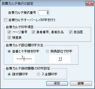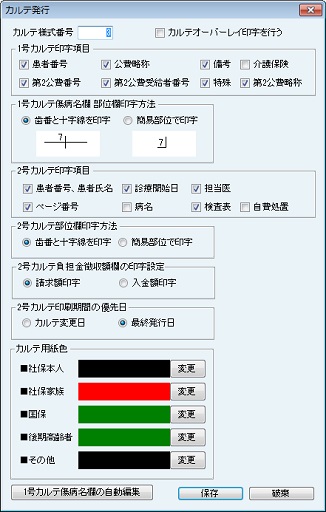 [カルテ発行の設定]画面が表示される。[カルテ様式番号]欄に使用するカルテの様式番号を入力する。その他の項目は、必要に応じてチェックボックスにチェックを付け、有効にする。