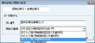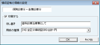 会計終了時に領収証発行をおこなう場合は、[会計終了時に領収証を発行する][会計終了時に介護領収証を発行する]のチェックボックスにクリックでチェックを付けると、会計終了時に領収証発行画面が自動表示される。