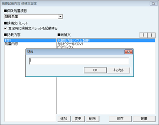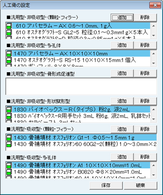[人工骨の設定]画面が表示される。人工骨の使用量から点数を自動で算定する為に必要な項目を設定する。