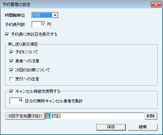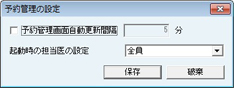 [予約管理の設定]画面が表示される。[予約管理画面自動更新間隔]にチェックを付けると、[予約管理]画面を表示中でも、設定した時間(分)で表示している情報の更新をおこなう。