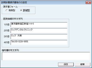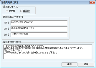 [医院情報印字文字列]には医院情報の設定で入力したものが反映されている。変更する場合は、各行に直接入力する。