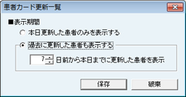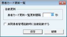 [患者カード更新一覧]画面が表示される。患者カード更新一覧画面を自動更新する時間間隔を設定する。