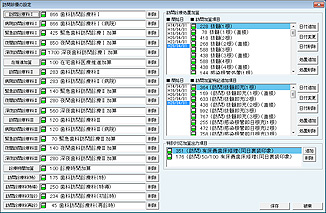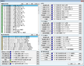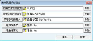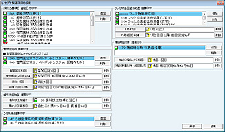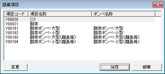 [削除]ボタンをクリックで設定されている項目を削除する。[追加]ボタンをクリックで設定の追加をする。項目を登録する場合は、[追加]ボタンをクリックで[項目検索]画面が表示されるので、設定する項目を検索し、クリックで選択する。[保存]ボタンをクリックで設定を保存終了する。[破棄]ボタンをクリックで変更内容を破棄する。