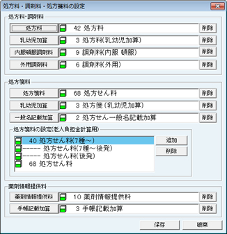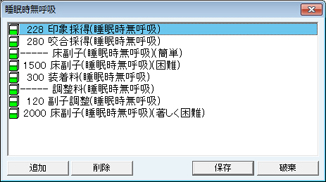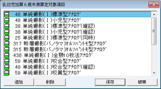 [入力時0点でも問い合わせを行わない処置群]欄に設定された処置は、0点の項目でも算定時にエラーメッセージを表示しない。処置の追加は[追加]ボタンをクリックし、表示される[項目検索]画面で検索し、追加する。処置を削除する場合は、削除する処置をクリックして選択し、[削除]ボタンをクリックする。