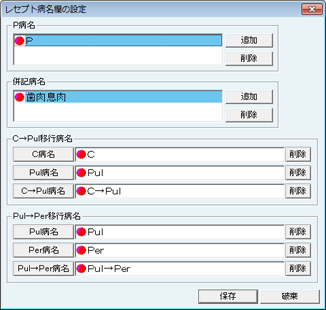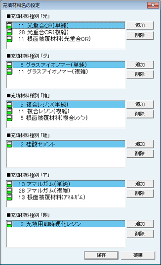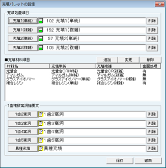 [充填材料名の設定]画面が表示される。材料種別ごとに材料名を設定する。