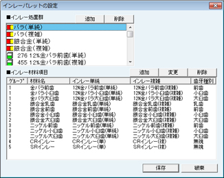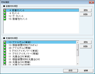 [材料項目]画面が表示される。装着材料項目と充填材料項目を設定する。