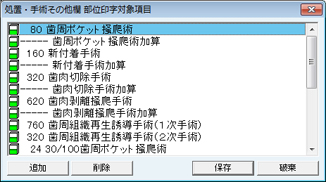 [処置・手術その他欄 部位印字対象項目]画面が表示される。歯周外科手術の保険処置項目を設定する。