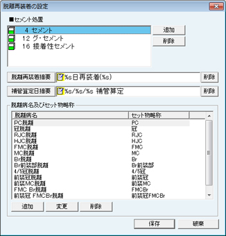 [脱離再装着]画面が表示される。再装着に使用するセメントの保険処置項目を設定する。