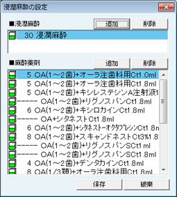 [浸潤麻酔の設定]画面が表示される。浸潤麻酔の保険処置項目および麻酔薬剤を設定する。