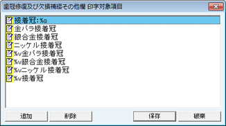 [歯冠修復及び欠損補綴その他欄 印字対象項目]画面が表示される。歯冠修復及び欠損補綴その他欄の印字対象項目を設定する。