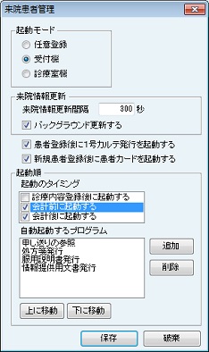 [来院患者管理]画面の表示と同時に[患者カード更新一覧]画面を表示する場合、[来院患者管理起動時に自動起動する]にチェックを付ける。