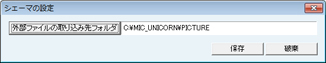 [シェーマの設定]画面が表示される。[外部ファイル取り込み先フォルダ]が設定されている。変更する場合は[外部ファイルの取り込み先フォルダ]ボタンをクリックし変更する。