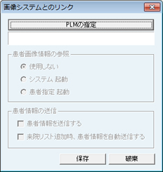 [画像システムとのリンク]画面が表示される。画像システムとのリンクをおこなっている場合に設定が必要。[PLMの指定]ボタンをクリックしてPLMプログラムの場所を指定する。[患者画像情報の参照]をおこなうタイミングを選択する。[患者情報を送信する]をおこなうタイミングを選択する。