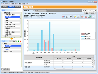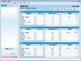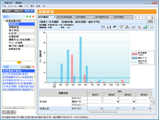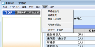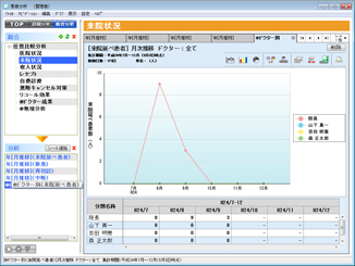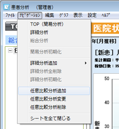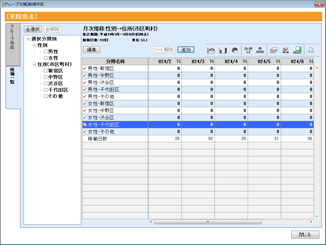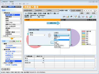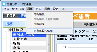 メニューバーの[編集]から[分析編集(連続分類)]を選択。対象の分析のうちから、分析したい内訳を選び、分類別(保険区分、曜日など)を選択する。