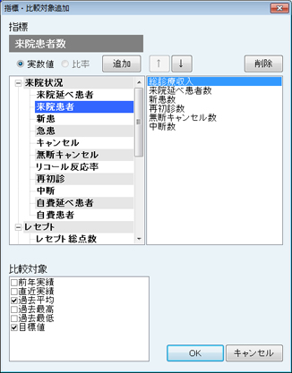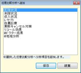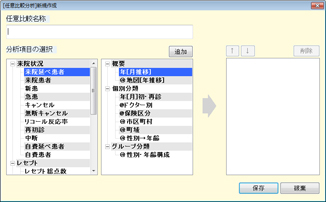 「分析」を選んでいる状態で、メニューバーの[編集]より[任意比較へ追加]を選択すると、[任意比較分析へ追加]画面が表示される。ここから[任意比較分析]の項目に該当の[分析]を追加することができる。