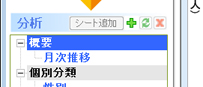 あたらしく[分析]をつくるには、画面左のナビゲーション欄内の[概要][個別分類][グループ分類]のいずれかを選択し、「分析」の[+]ボタンをクリックで新規作成画面が表示される。