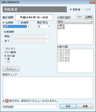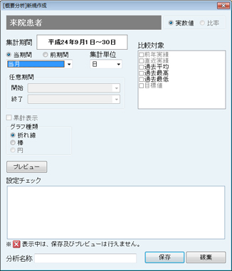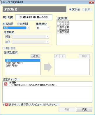 - 期間と集計単位の組み合わせに矛盾があると、[設定チェック]欄に注意表示が出るので、修正してください。