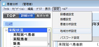 地域分析を行うには、あらかじめ市区町村・町域の設定が必要。メニューバーの[設定]⇒[地域分析設定]をクリック。