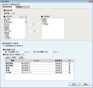 [地域分析設定]画面にて、市区町村・町域リストに表示されるリストを追加・削除できる。