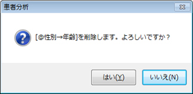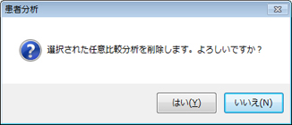 対象の分析を選んでいる状態で、[削除]ボタンをクリックすると、「[○○○○]を削除します。よろしいですか?」というメッセージが表示される。[はい(Y)」ボタンをクリックすると、その分析が削除される。復活できないので、注意が必要。