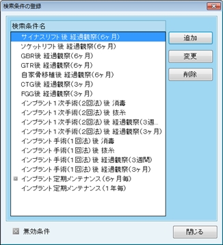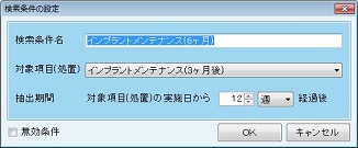[検索条件名]を入力し 、[対象項目(処置)]を選択、[抽出期間]の日数を設定し、[OK]ボタンをクリックし設定を終了する。