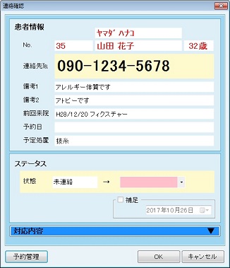 [連絡確認]画面で[ステータス]を選択、必要に応じて[補足]を設定し、[OK]ボタンをクリックし設定を終了する。メモが必要であれば、[対応内容]をクリックして入力できる。