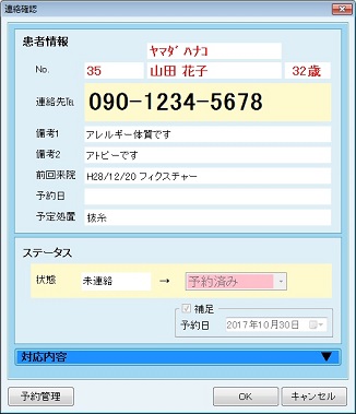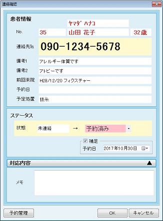 [連絡確認]画面では、[予約管理]ボタンが有効になる。[予約管理]ボタンをクリックすると、[予約管理]画面が表示される。[予約管理]画面の終了時に予約情報を取得し、[連絡確認]画面の[ステータス]と [補足]に情報が反映される。