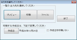 [出力先を選択してください]画面で、必要に応じて[作成日]を設定し、[プレビュー]ボタン、もしくは[印刷]ボタン、または[ファイル]ボタンをクリックする。