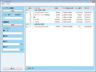 [トレーサビリティ]画面の詳細検索で、[メーカー]、[型番]、[直径]、[全長]を選択、もしくは検索値を入力して、[検索]ボタンをクリックする。