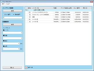 [トレーサビリティ]画面では、検索条件を入力し、[検索]ボタンをクリックすると、検索したインプラントが埋入されている患者を一覧で表示する。