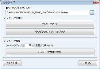 [バックアップ先フォルダ]欄でバックアップデータの格納先を設定する。[バックアップの実行]欄では[フルバックアップ]または[トランザクションログバックアップ]を実行できる(フルバックアップは全データを対象とする)。バックアップの履歴を確認したい場合は、[バックアップ履歴の参照]から確認できる。