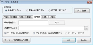 [自動設定]欄ではデータベースの退避が自動実行するタイミングを設定できる。[退避先フォルダ]欄を設定することで、データベースの退避が実行可能になる。[実行]ボタンをクリックすると、データベースの退避を実行する。データベース退避の履歴を確認したい場合は、[データベース退避ログの参照]から確認できる。