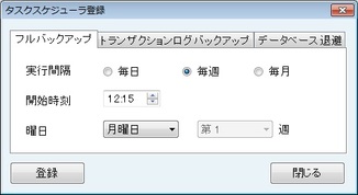 [バックアップ]、[データベースの退避]画面で[タスク登録]ボタンをクリックすると[タスクスケジューラ登録]画面が表示される。[フルバックアップ]、[トランザクションログバックアップ]、[データベース退避]それぞれの画面でバックアップを自動実行するタイミングを設定し[登録]ボタンで登録する。登録後、設定したタイミングでバックアップやデータベースの退避自動実行される。