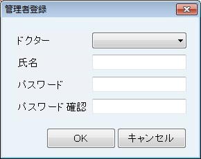 [管理者登録]画面では管理者アカウントの登録を行う。氏名、パスワードを入力し[OK]ボタンで登録完了。ドクターの選択は任意で行う。