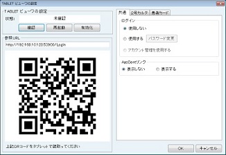 [TABLET ビューワの設定]欄では状態の確認、機能の有効化、再起動を行うことができる。[参照URL]欄では、ブラウザ等で[TABLET ビューワ]にアクセスするためのURLとQRコードを表示する。