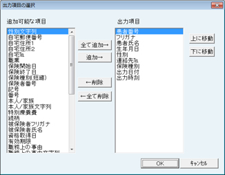[出力項目選択]ボタンをクリックすると[出力項目の選択]画面が表示され、ファイル出力する項目の選択ができる。項目を選択して[追加→]、[←削除]ボタンで追加・削除する。[全て追加→][←全て削除]ボタンで出力項目に全項目が追加・削除できる。